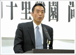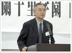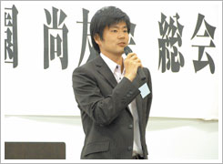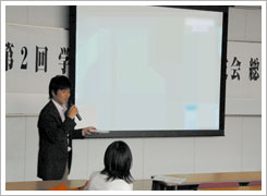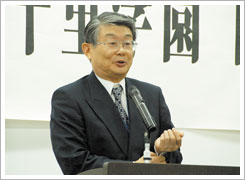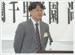 また、予定どおり視聴覚教室にて、13期生 大中章氏司会のもと、総会が開催されました。中條富士人尚友会会長、辻本賢学園理事長の挨拶と加藤信明事務局長の会計報告の後、24期生NHK大阪アナウンサー澗随操司氏による講演が行われました。