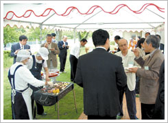 午後1時頃からは『光の広場』にて、懇親会が盛況に開催されました。創設からの写真が展示され、在校時を思い出す懐かしいものでありました。光の広場から外に出た、緑の芝生があるテラスにて、バーベキューを用意し、屋外での食事を楽しみました。